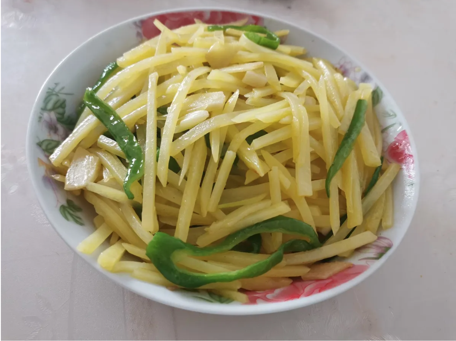 T/N: Tomatoes in scrambled eggs and stir-fried potatoes with green peppers.