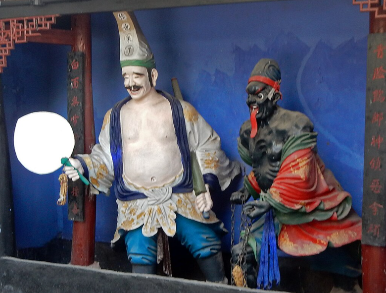 As for this photo below, these are statues from Fengdu Ghost City (remember this? the 2,000 year old temple complex dedicated to Youdu that has now become a tourist attraction). As per their usual iconography, White Impermanence carries a fan, has a friendly expression, and is taller of the two. Black Impermanence has a chain and looks fierce.